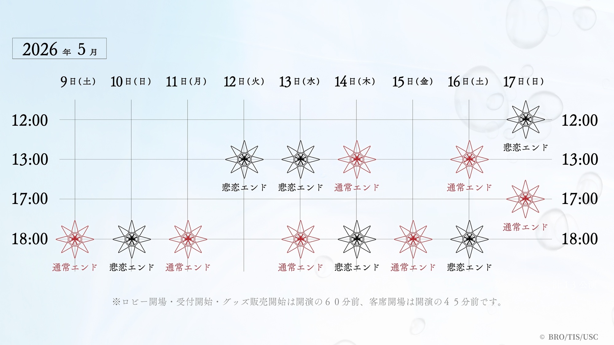 ※ロビー開場・受付開始・グッズ販売開始は開演の60分前、客席開場は開演の45分前です。