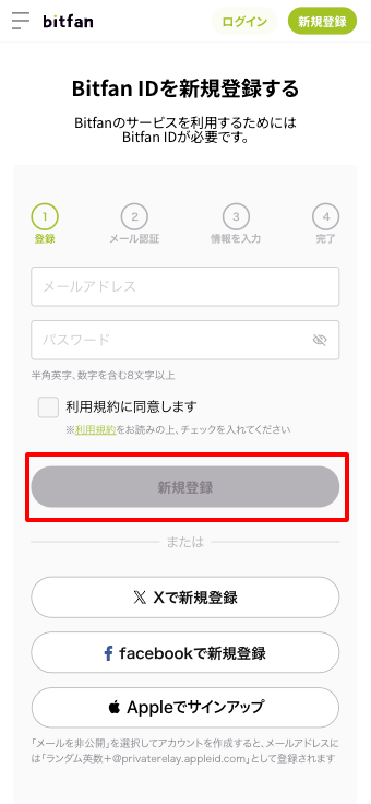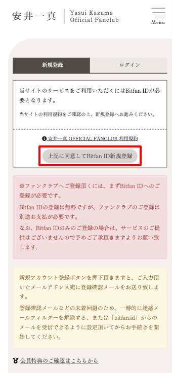 当サイトの利用規約をご確認の上、「上記に同意してBitfan ID新規取得」をクリックして、新規ID登録画面へお進みください。