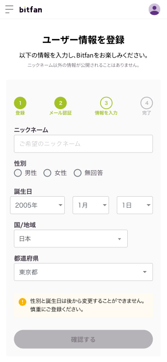④ ②で入力したメールアドレスとパスワードでログインし、ニックネームと性別・誕生日を入力後、国/地域・都道府県を入力してBitfan IDの本登録を完了してください。